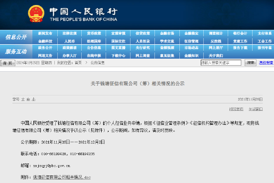 2021年11月,央行发布《关于钱塘征信有限公司(筹)相关情况的公示》,表示央行受理了钱塘征信的个人征信业务申请,根据《征信业管理条例》《征信机构管理办法》等规定,将其相关情况予以公示。