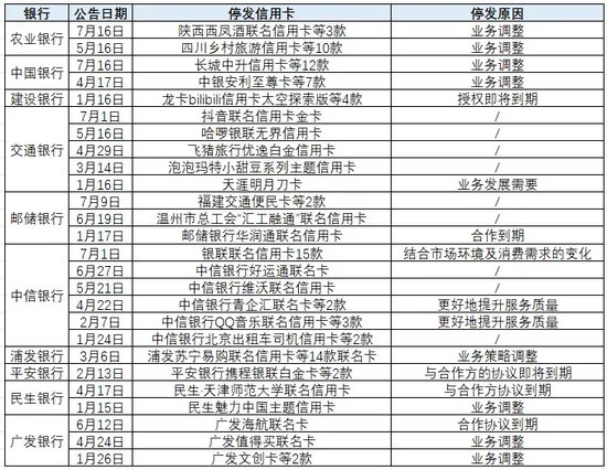 值得关注的是,此次停发潮中,联名信用卡成为“主力”,“业务调整”“更好提升服务质量”“合作到期”等是主要停发关键词。