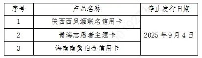 同日,农业银行信用卡中心也宣布,2025年9月4日起,将停发陕西西凤酒联名信用卡、青海志愿者主题卡、海南南繁白金信用卡,产品停发后,该行线上及线下网点等各渠道均不支持申请,但存量卡仍可正常使用。如遇损坏换卡、挂失补卡、到期换卡情况,该行将使用原卡面或逐步更换为标准白金卡卡面,产品相关功能权益及收费标准保持不变。