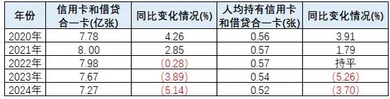 央行数据显示,信用卡存量规模已连续三年下降。具体来看,截至2024年末,信用卡和借贷合一卡7.27亿张,同比下降5.14%;人均持有信用卡和借贷合一卡0.52张,同比下降3.7%。