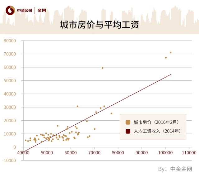 70个主要城市中,2014年平均工资最低的邯郸只有41219元,最高的北京人均102268元,不足邯郸的2.5倍。要知道,北京房价(70943元/平米)是邯郸(5097元/平米)的13.9倍。这是个什么概念,自己去想吧!假如北京邯郸两地房价存在套利空间,是北京房价太高还是邯郸房价太低了呢?如果将各个城市的房价与工资做成一个散点图,如下: