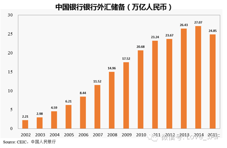 汇率多年的低估造成了经常账户和资本账户“双顺差”,即带来了多余的外币。国际收支要平衡,央行又不想让人民币升值的话,就只能把多余的外币买下来,这就是中国过去十多年外汇储备大幅增加的原因(参见下图)。