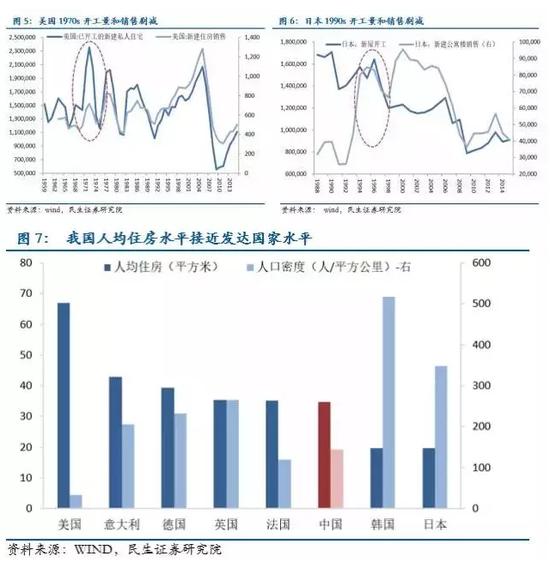 (1)我国户均住房达1.05套,房地产开发投资和销售临近拐点。据测算,我国城镇存量住房超200亿平米,户均住房约为1.05套。在美国的70年代和日本的90年代,当存量住房达到户均1.1套时,房地产开发见顶,新房市场基本饱和,开发投资和销售迅速回落。根据国际经验,我国户均住房已接近1.1套的拐点,房地产开发投资和销售未来增长空间有限。