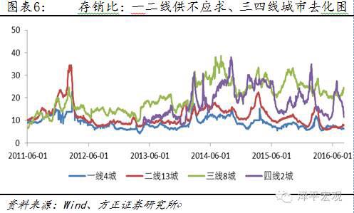 我国广大三四线城市、中西部地区和资源型城市圈存在较高库存泡沫。用完工待售面积表示狭义库存,用累计开工减去累计销售表示广义库存,两者都一路走高,在2016年上半年才开始回落。目前去库存大幕刚启,任务依然很重,去库存将是持久战。