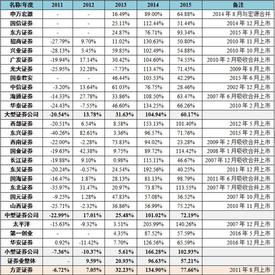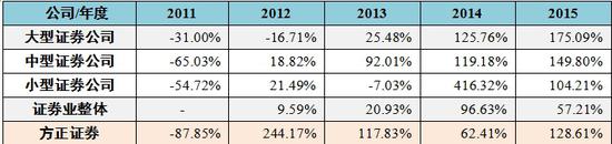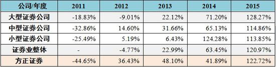 表3 2010-2015年方正证券净利润增长率比较