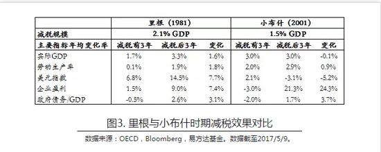 多数人设想中的模板是里根时代带来大繁荣的减税,而遗忘了小布什时代同样有过大规模减税。不过,那次减税的成果是大幅增加的财政赤字以及最终引发全球金融危机的信贷大泡沫,人们不愿提及也是人之常情。但作为投资者应该思考的问题是: