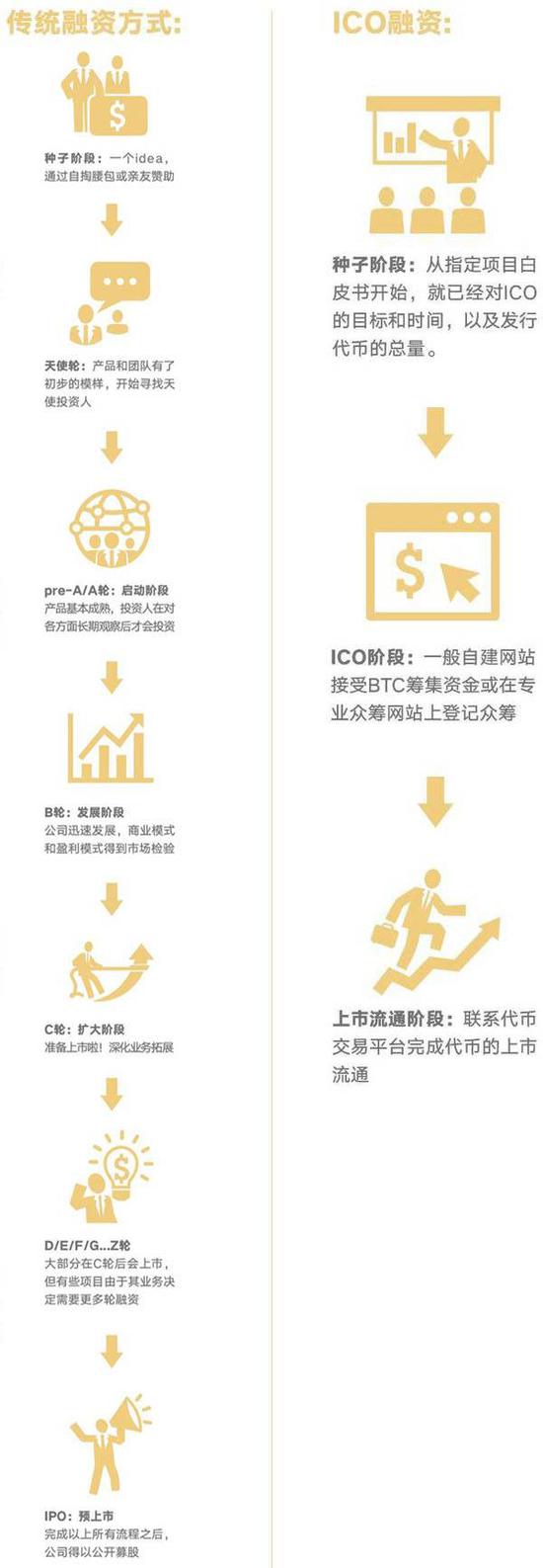 通过对比IPO可以看出,在ICO过程中:没有证监会,不需要IPO上市审批排队,没有传统的种子天使ABCD轮,发行后没有持有禁售期, 不需要律师、会计师和投行。 ICO从开始到结束,所有发行环节一步到位,因而能如此高效便捷。甚至在ICO后,代币的使用和交易都非常方便。
