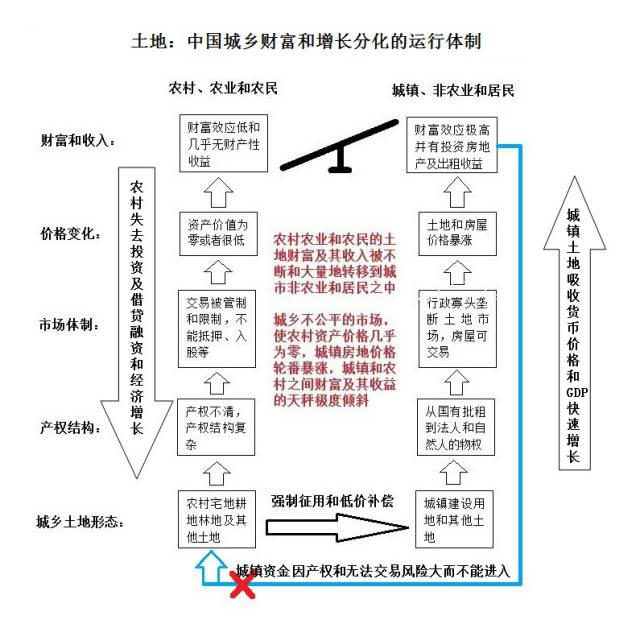 城乡二元收入差距与消费不足传导的消费不足和生产过剩是另一个问题。财富在城市极端膨胀,农村土地资产成为僵尸资产,不值钱。户籍制度使农民未能市民化,收入和公共服务要差了很大一截。这是整个土地财富的模型,城里急剧上涨,农村是相对不行的。