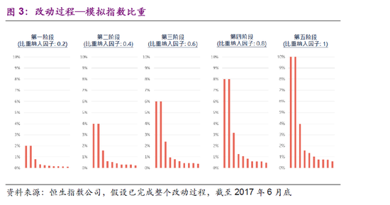 其中,为了平稳过度减少对于市场的扰动,新增的10只红筹股/民营企业成分股将会分5个阶段加入恒生中国企业指数内,为期12个月。其中第一阶段为2018年3月份,比重纳入因子0.3,调整后的比重上限为2%(全部调整后的比例上限为10%)。