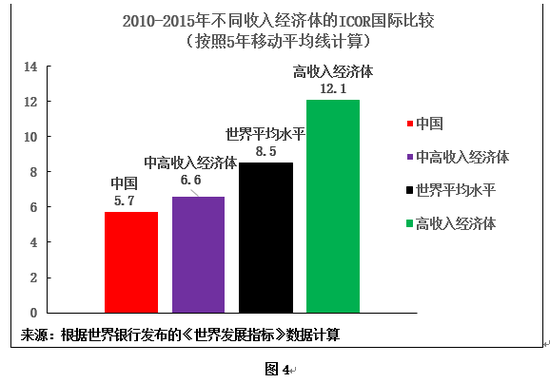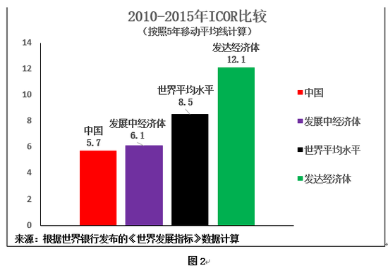 图1呈现的是以世界银行提供的最新国际可比数据为依据的2015年ICOR比较: