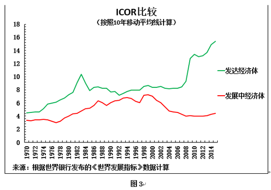 最后,为体现长期框架,以及结构特征,图3为大家呈现按照能消除经济周期波动影响的10年移动平均线计算的ICOR比较。可以看出,在整个比较期间,高收入经济体ICOR高于发展中经济体,正好吻合新结构经济学的分析。