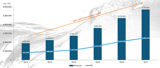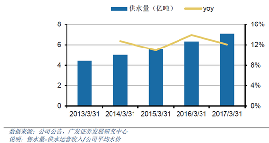 注:粤海投资以供应原水为主要收入从业务上来看,截止2017年9月,中国水务(855.HK))业务覆盖全国13个省和3个直辖市,超过50座城市,服务人口超过2,000万,已投运水处理能力约为796万吨每日,设计新增处理能力超过471万吨每日。过去十多年,中国水务供水业务量价齐升,这是公司营收利润快速增长的根本原因。根据广发研报,过去5年公司售水量年均复合增速为12.4%,且每年增速都在10%以上,较为均衡;2016/17财年公司售水量为7.08亿吨,比上年增长了12.1%。价格方面,根据E20供水联盟的数据,2011-2015年,我国平均水价从1.91元/立方米逐年上涨到2.26元/立方米,年均复合增速为4.3%,并在近年有加速上涨的势头。
