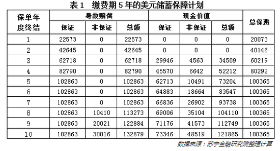 一是年度人民币缴费额下降。比如每年缴费20073美元、缴费期为5年的储蓄保障计划产品(参见表1),如果缴费期为年底,那么在2016年底按美元兑人民币6.9495的汇率计算,则当年的保费应缴13.95万人民币(=20073×6.9495);2017年底人民币兑美元升值到6.5120,那么2017年的保费应缴13.07万人民币(=20073×6.5120)。可见,2017年人民币升值了6%左右,对应的每年的人民币缴费额也节省了6%左右。所以,对于购买美元保险产品的用户来说,人民币升值有节省保费的作用。