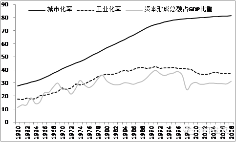 图2 韩国工业化率、城市化率和资本形成占GDP比重