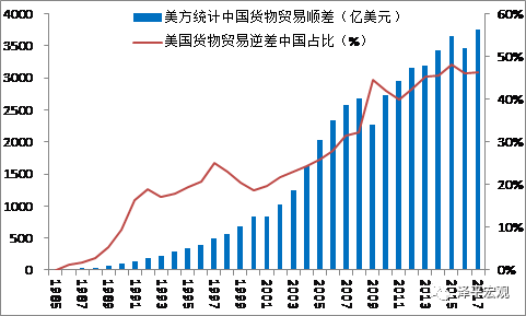 1、中美贸易严重失衡是特朗普挑起贸易战的直接原因,美方要求中国降低美对华贸易赤字1000亿美元,进一步开放市场。中美贸易格局目前是中国货物贸易顺差、服务贸易逆差,这反映了中美比较优势。根据中方统计,2017年中国对美货物贸易顺差2758亿美元,占中国货物贸易顺差的65.3%;而据美方统计,2017年美国对华货物贸易逆差3752亿美元,占美国货物贸易逆差的46.3%,高于排第二位至第九位的八个国家之和(44%)。