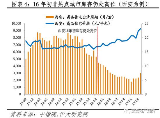 16年全国楼市冷热不均,一线城市和强二线城市房价暴涨、库存告急,但非核心城市库存依然严峻。以南京和西安为例,15年“330”后南京房市复苏,住宅出清周期在16年3月降至2.8个月的历史极低位置,库存告急;而同期西安住宅出清周期仍高达13.3个月,库存淤积严重。