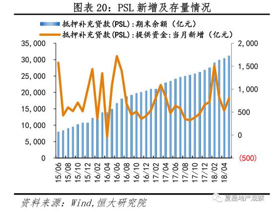 资金来源方面,央行2014年创设PSL并通过国开行、农发行发放棚改贷款,为棚改提供了丰富的资金来源。2017年PSL累计新增6350亿,年底余额2.69万亿,同增30.8%。2018年以来棚改货币化安置步伐继续,1-5月累积新增PSL 4371亿,同增76.9%,余额3.1万亿,同增33.1%。