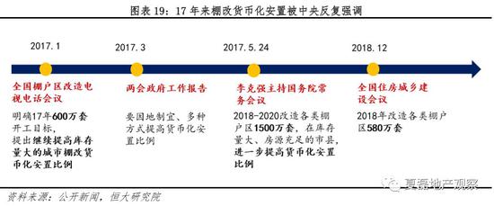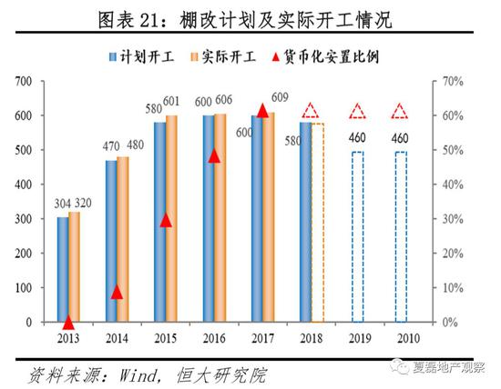16、17年是棚改货币化安置大年,17年3月两会提出“要因地制宜、多种方式提高货币化安置比例”、17年5月国务院常务会议提出“在库存量大、房源充足的县市进一步提高货币化安置比例。”具体而言,16年计划新开工600万套,实际开工606套,货币化安置比例48.5%,相比15年大幅提高18.6个百分点;2017年计划新开工600万套,实际开工609万套,货币化安置比例60%(估计)。