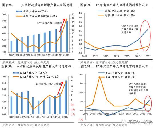 人才引进带来户籍人口快速增加,为房地产市场带来增量需求。以17年出台人才政策的南京、武汉为例,南京2017年新增户籍人口17.9万人,而过去十年年均新增户籍人口仅5万,17年户籍人口同比增长率高达2.7%,远超常住人口增长率0.79%;武汉17年新增户籍人口19.8万人,过去十年均值仅1.5万,户籍人口同比增长率2.37%,首度超过常住人口(1.18%)。