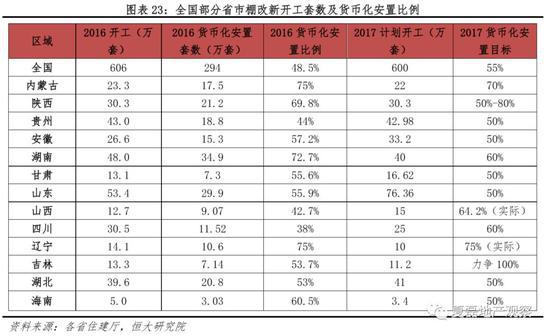 分省市来看,山东、贵州、湖南、湖北是棚改大省,17年计划新开工在40万套以上,辽宁、吉林、内蒙古货币化安置比例最高,均在70%以上。总体来看,各省货币化安置比例均在50%以上。