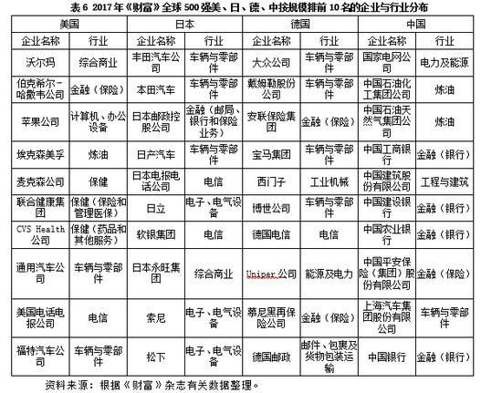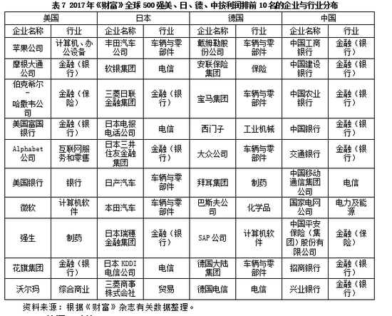 有关(其中1家计算机与办公设备、1家互联网服务与零售、1家计算机软件),1家综合商业,1家个综合制药。日本的行业分布在4个部门,车辆与零部件、金融与电信三足鼎立。德国的行业相对分散度高,涉及7个行业,自动化相对强的车辆与零部件占据4家。中国的行业分布相当单一,都是垄断部门,主要涉及3个大的行业,其中8家集中在金融领域,这8家当中有7家属于银行系统。1家电信领域,1家电力及能源领域。