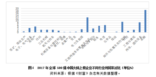 如图4所示,中国在本国国内不同产业之间的利润率也存在很大差异。利润率最高的6个行业分别为金融、互联网服务与零售(含一家专业零售)、邮件包裹及货物运输、网络、通讯与通讯设备、电信等相对垄断以及高新技术行业。利润率最低的六个行业分别为化学品、建材与玻璃、贸易、炼油、采矿和原油生产等行业。总体上,金融业的利润率独占鳌头。