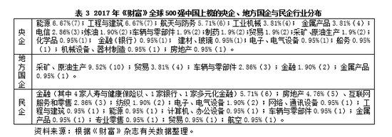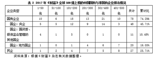 在105家大陆上榜企业中,国有企业共78家[2],占比74.29%,其中央企48家,占比45.714%,地方国企共20家,占19.05%;民企27家,占比25.72%。总体来看,相对于央企,民企的排名相对落后,这也符合预期,同时反应了目前我国世界级民企的实力较之央企仍然远远落后。在排名1-100之间,国企共16家,央企和地方国企共11家,而民企仅3家。在排名101-200之间,国企有18家,央企和地方国企共14家,民企只有3家。在排名201-300之间,国企有13家,并且全部是央企和地方国企,民企只有7家。在排名301-400之间,国企有21家,央企和地方国企共20家,民企仅5家。在排名401-500之间,国企共有10家,都为央企或地方国企,民企则达到8家。但民营企业也取得较大进步,部分有潜力的企业具备非常好的国际竞争力。如华为公司和联想集团在通信领域实力雄厚,吉利集团通过并购沃尔沃在汽车领域独树一帜,腾讯公司则在互联网领域异军崛起。从央企和地方国企的比较情况来看,当前地方国企的排名总体上较央企仍有较大差距;而且和民企相比,进入500强的企业家少,在排名1-300之间的企业,地方国企也没有占据明显优势,甚至更为落后,这也反应了我国地方国企发展动力并不足,其潜力有待挖掘。
