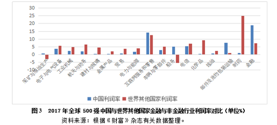 从国家间的比较来看,如图3所示,中国与世界其他国家在不同行业间的利润率也存在一定差距。在17个产业中,中国有5个行业的利润率高于世界平均水平,分别是金融、船务、邮件与包裹及货物包装运输、采矿与原油生产、互联网服务和零售。其中金融比世界全部行业利润率的平均水平高出11.58%,船务比世界水平高10.47%,邮件与包裹及货物包装运输比世界水平高6.77%。中国利润率严重落后世界平均水平的5个行业则依次为制药、化学品、建材与玻璃、航天与防务、贸易。其中,制药比世界水平低了23.84%,化学品比世界水平低9.15%。整体上,统计数据说明,我国金融业高出世界其他国家金融业利润率的水平远远大于其他行业。