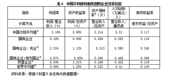 从非金融行业方面的效率来看,如表5所示,国有企业的利润率比大陆平均水平低了约1.11%,比民营企业约低2.86%,但央企的利润率比地方国企的利润率约高0.97%,值得庆喜的是,民营企业的利润率比世界平均值约高0.13%。在资产收益率方面,民营企业的水平比央企和地方国有企业都要高,其中比央企高约高1.1%,比地方国企约高1.23%,但比世界水平低了0.81%;同时无论央企还是地方国企,两者的资产收益率均低于世界平均水平。从利润率和资产收益率两个指标来看,民营的效益最高,央企次之,地方国企最差。在资产周转率方面,民企的水平低于国企,但比央企高,比地方国企低。同时,根据国际比较,可以发现地方国企的水平比世界平均水平高,民企和央企都比世界水平低。在人均创收方面,民企比国有企业与世界水平都要高,央企比地方国企水平低;国有企业的人均创收低于世界平均水平,但地方国企业的人均创收高于世界水平。在股权收益率方面,民企略高于地方国企,但比央企低。而且无论央企、地方国企还是民企,它们的股权收益水平都低于世界水平。
