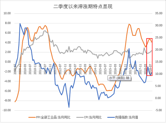 从“叫声”看,根据经典美林时钟框架,经济放缓叠加通胀上升时,经济周期将显示滞涨期特点。今年二季度以来,以克强指数为代表的经济指标遭遇内在去杠杆争议与外来贸易摩擦冲击的双重压力,开启下行;同时以PPI与CPI为代表的通胀指双双上行;经济下行+通胀上行的滞涨期特征已现端倪。