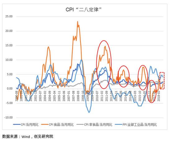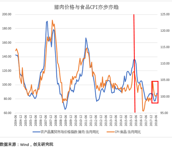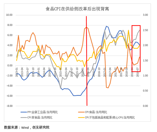 2016年以来,PPI、非食品CPI以及剔除食品与能源的核心CPI上行斜率几乎一致,可见彼此间传导机制并未消失;然而巧合的是,2016年中,食品CPI突然独立大幅下行,在很大程度上抵消了来自PPI的上游传导,呈现出的结果为CPI“胸有万兵而波澜不惊”。