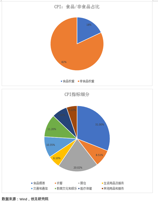 从微观角度解构CPI,我们发现CPI食品项目仅占不到二成,八成以上由非食品项目构成,其中居住项为非食品项中权重最大单项,占比达20%。