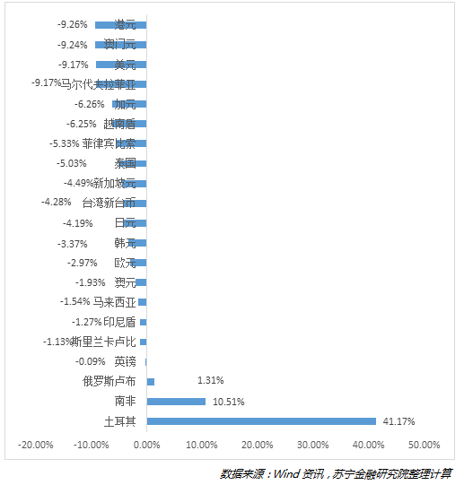 具体来看,人民币对不同货币的贬值区间可划分为三大类: