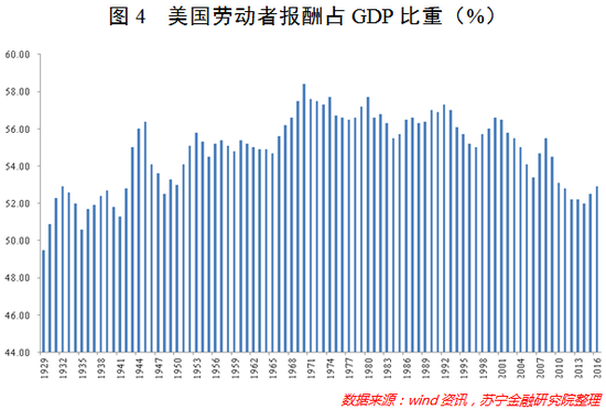 美国的政策制定从来都是以国人分享经济发展成果为取向,在国家强大的同时不忘促进民富。具体来看,在初次分配环节,美国劳动者报酬占GDP的比重几乎从未低于50%,且常年保持在55%左右的高位上(参见图4),这有力地提高了居民所得。