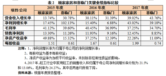 2015-201年,尽管喜临门营业收入增长率逐年提升,但净利润增长率不稳定;毛利率和销售净利润均低于顾家家居,这也是导致净资产收益率相对较低的根本原因。