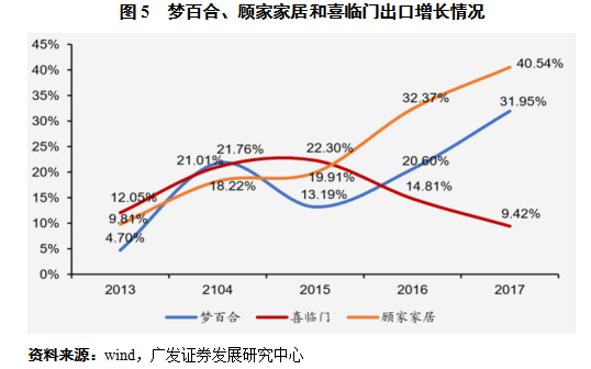 顾家家居和喜临门在外销方面均采用OEM和ODM方式,市场基本均为北美市场。截至2017年12月31日,顾家家居和喜临门出口收入分别占营业收入比例为35%和22%。从增长趋势看,2015年为顾家家居和喜临门出口收入增长的分水岭。2017年度,顾家家居出口收入增长40.54%,其中美国和加拿大分别增长51.2%和62.1%;喜临门出口收入为9.42%(见图5)。