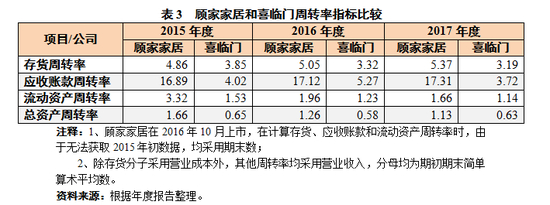 顾家家居各项周转率指标相对更高(见表3)。存货周转率和流动资产周转率快于喜临门,应收账款和总资产周转率分别快3倍和2倍。这可能与顾家家居推行全款下单方式直接相关。