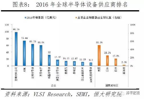 2016年全球前十名半导体设备供应商中,除了荷兰的ASML、新加坡的ASM Pacific,其余四家位于美国、四家位于日本,其中美国的应用材料公司(AMAT)排名第一、2016年销售额达100亿美元。四家美国公司已经占到全球市场份额的50%,即使第二名荷兰光刻巨头ASML股东中也有着英特尔的身影。而在此领域国内尚无企业上榜,2016年中国半导体设备销售仅57.33亿元,其中中电科电子装备集团排名第一,但销售金额也仅9.08亿,中国前十强占全球半导体设备市场份额仅2%。长年占据全球半导体设备榜首的美国AMAT产品几乎横跨CVD、PVD、刻蚀、CMP等除了光刻机外的所有半导体设备,公司的30%员工为研发人员,拥有12000项专利,每年研发投入超过15亿美元,而国内半导体设备龙头北方华创研发支出不到1亿美元。