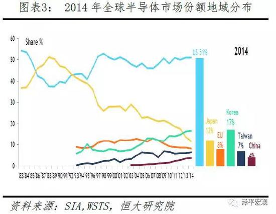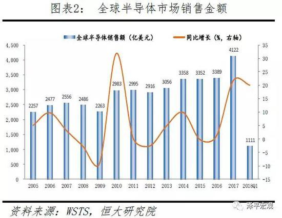 全球半导体产业市场规模已经从1996年1320亿美元增长至2017年4122亿美元。根据美国半导体行业协会(SIA)的统计,按照半导体企业总部所在地分类,目前美国公司占到全球半导体市场份额的一半左右,其次为韩国、日本,中国目前市场份额在5%左右。