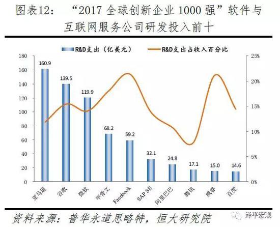 根据普华永道思略特发布的“2017全球创新企业1000强榜单”,其中软件与互联网服务公司按照研发投入排名的创新十强榜单中,中国凭借BAT占据第7、第8及第10名,前五名清一色为美国企业——亚马逊、谷歌、微软、甲骨文、Facebook。美国前三强软件与互联网服务公司亚马逊、谷歌、微软的研发支出均超过百亿美元,相比BAT中最高的阿里巴巴也仅达到25亿美元。
