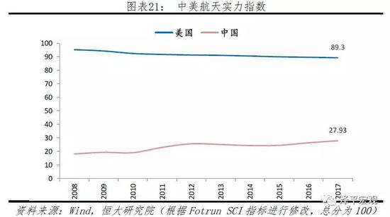 从政府活动(包括政策支持力度、预算开支情况、国际合作情况等)、人员和航天器(宇航员人数、相关学科大学及以上储备人才数量、在轨航天器数量等)、相关工业(制造能力、发射能力、地面操控能力等)这三方面能力进行评定,2017年我国航天实力指数为27.93,较2016年有所提升;美国航天实力指数为89.3居全球首位,但近年来有所下降。综合来看,目前我国航天实力排名全球第四、仍处于第二梯队。