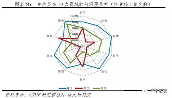 与航天相关性强的天文学与天体物理、物理学等基础研究较为薄弱。根据中国科学院科技战略咨询研究院《2016研究前沿》显示,从Essential Science Indicators(ESI)数据库的上万个研究前沿挑选出的共180个重点热点前沿为基础来分析10大学科中各国与所在国相关科研机构对重点热点前沿产出论文数量和论文影响力,在物理学的20个热点前沿领域美国引领数达到11个,中国仅2个;在天文学与天体物理的12个热点前沿领域,美国引领数达到10个,中国尚无斩获。