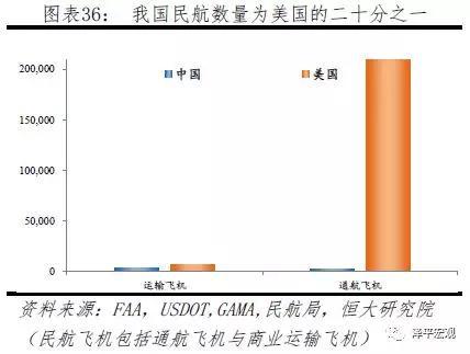 民用飞机方面,我国现役共5593架飞机,约美国的二十分之一。运输机,即客运机方面,我国小型客运机自主化程度较高,但大型客运机基本全部依靠进口。通航飞机方面差距更大。通航飞机指民用除去商用运输以外的所有飞机总称,可以用于空中降雨、空中喷洒等。美国农业林业机械化程度高,对通航飞机需求大,我国目前尚处于人力与机械力交换过程,通航飞机存量较低。