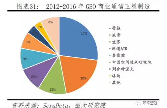 卫星制造与卫星发射对资金、人才、技术都具有高要求,全球参与公司或者政府部门约为30个,其中,欧美六大制造商占80%以上的市场份额。以GEO商业通信卫星制造订单为例,美国波音、劳拉、轨道ATK与洛马占62%,垄断过半市场。