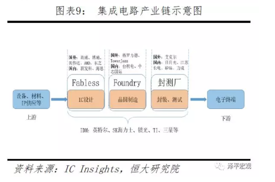 站在产业链的角度,集成电路可以分为设计、制造与封装测试三个环节,其中垂直一体化模式称之为IDM(Integrated Device Manufacture),以英特尔、三星为代表;专业化分工则可以分为Fabless(IC设计)、Foundry(晶圆代工)、封测,Fabless的核心是IP,以高通为代表;Foundry的核心是制程与工艺的先进性与稳定性,以台积电为代表;封测相对来说对技术的要求不如前两者。