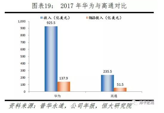 通信是信息社会的“神经网络”。当前全球四大通信设备巨头华为、爱立信、诺基亚、中兴,中国占据其二。华为2017年销售额925.5亿美元,研发投入137.9亿美元,大幅超越传统通信设备巨头爱立信与诺基亚。与美国无线通信巨头高通相比,华为的收入与研发投入体量同样领先。在过去十年内,华为在研发领域累计投入近4000亿人民币,目前拥有超过7万份专利(超过90%是发明专利)。