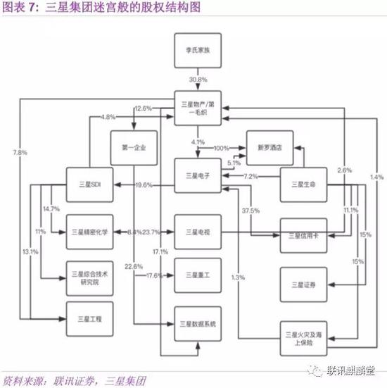 如三星集团的股权结构图所示,财阀集团的子公司之间往往互相出资,形成超级复杂的网状结构。在这样的股权架构下,财阀的子公司互相勾结,通过内部交易互相支撑,削弱了财阀企业的透明度。它也像一个蜘蛛网一般笼罩住韩国经济,使得韩国难以迸发出经济增长的新活力。