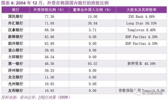 外国资本加速进入韩国的银行业。1999年美国新桥资本收购韩国第一银行,2003年美国孤星投资基金收购韩国外汇银行。至2005年末,韩国SC第一银行的外资持股比例达到了100%,外汇银行外资股份高达74%,全国性银行的外国股权比率平均超过50%。