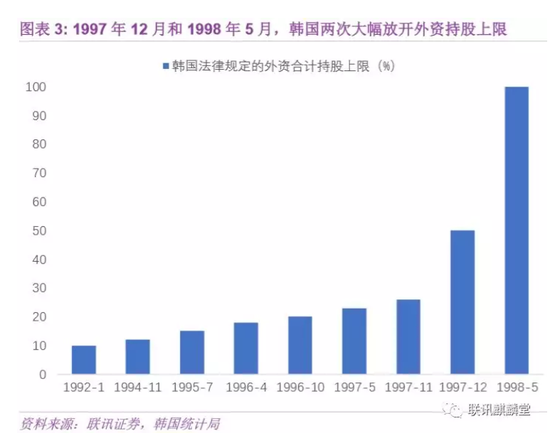 最后,对外国投资者完全开放金融市场。危机之后,韩国政府应IMF要求对外国投资者开放金融市场,取消了外资股权的全部上限规定,允许外资股权参与和对银行部门进行投资。进一步提高外汇市场、债券市场、保险领域等的开放程度,1997年韩国政府正式宣称将实施外汇交易自由化。