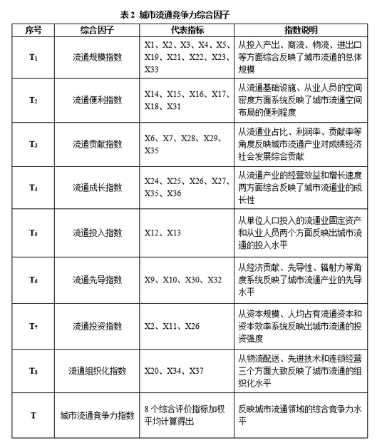 在确定8个综合指标后,进一步借助SPSS统计软件对综合指标与原始指标之间的关联关系进行定量分析,最后形成了“流通规模指数”(T1)、“流通便利指数”(T2)、“流通贡献指数”(T3)、“流通成长指数”(T4)、“流通投入指数(T5)”、“流通先导指数”(T6)、“流通投资指数”(T7)及“流通组织化指数”(T8)8个城市流通竞争力综合评价指标。在此基础上,采用加权平均的方法,由8个综合评价指标计算出集成度最高的评价指标“城市流通竞争力指数”(T),对城市流通领域的综合竞争力进行衡量。